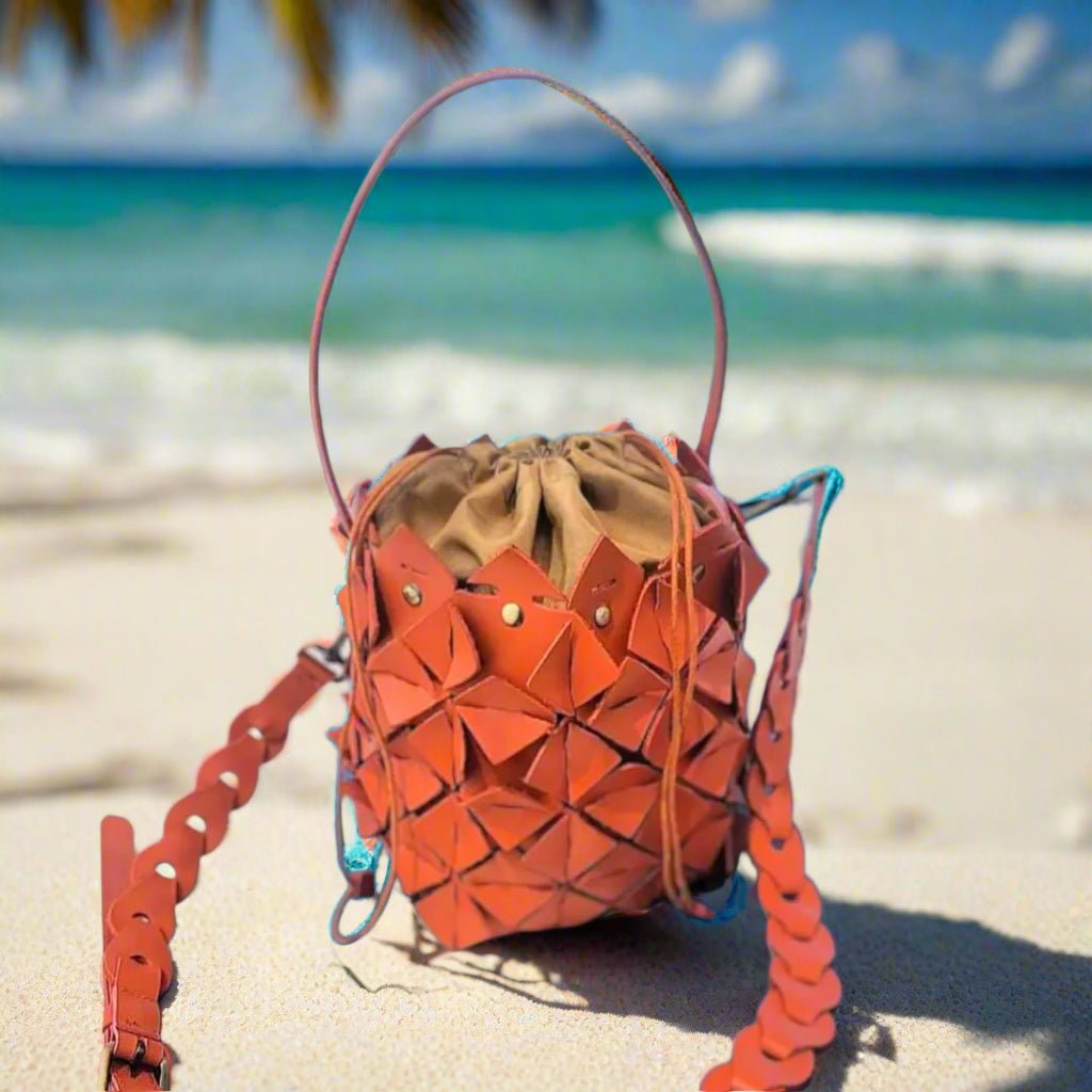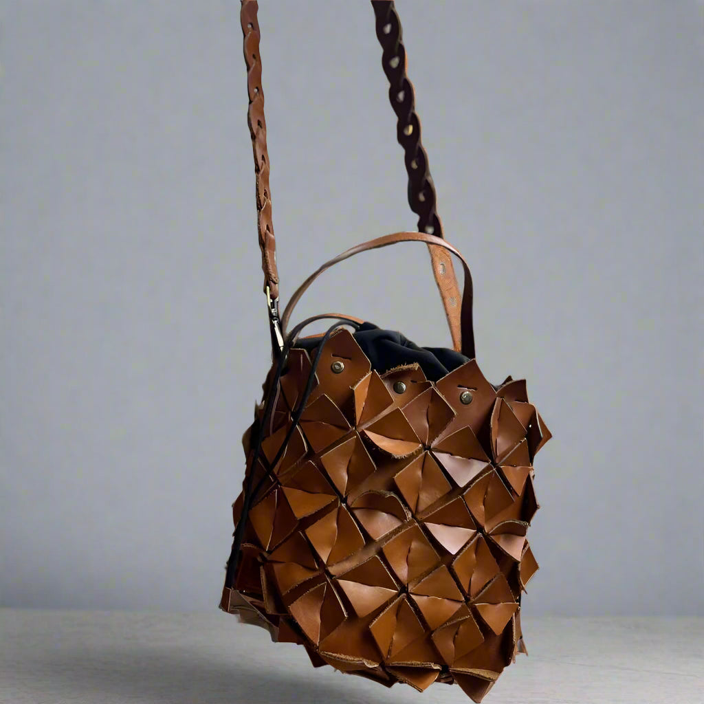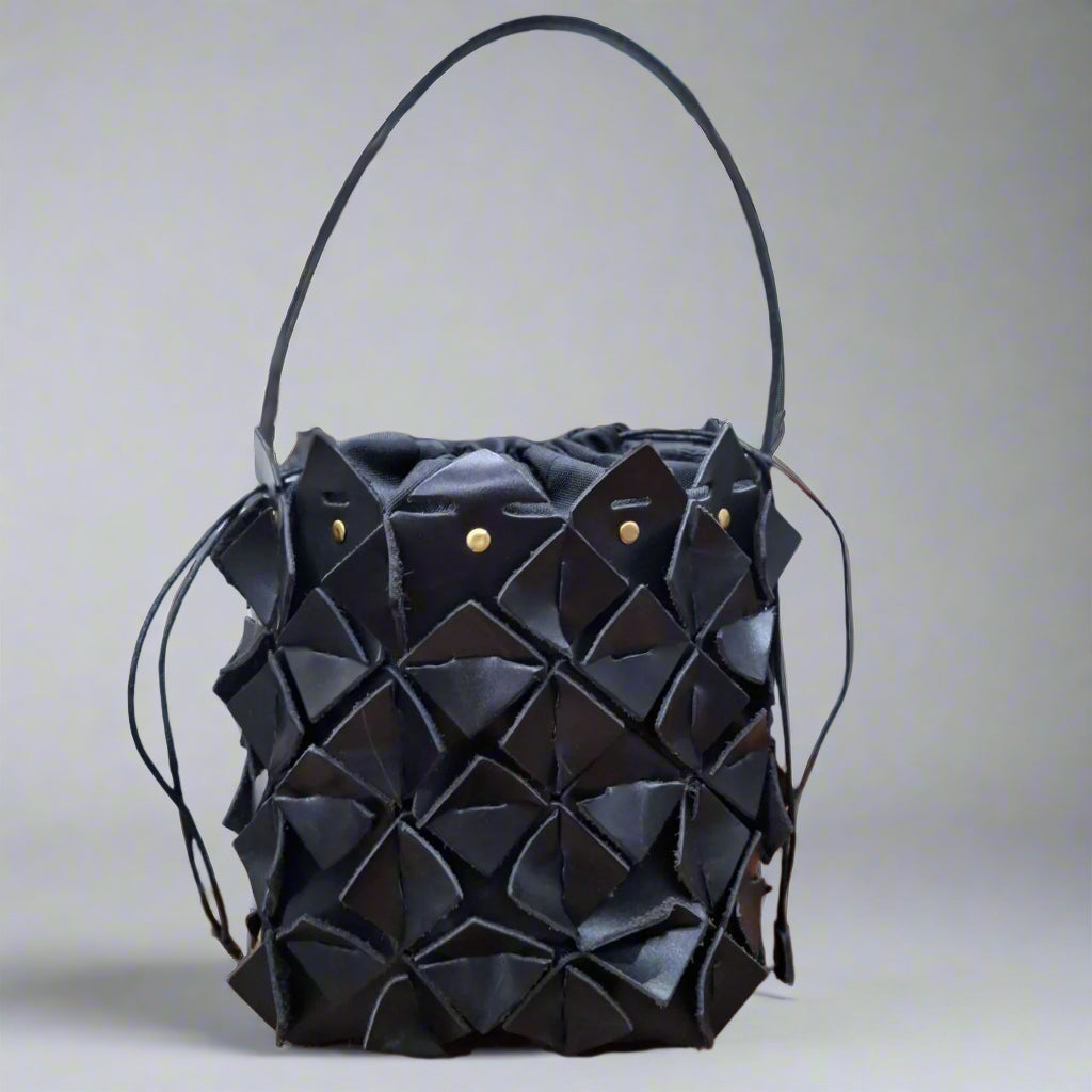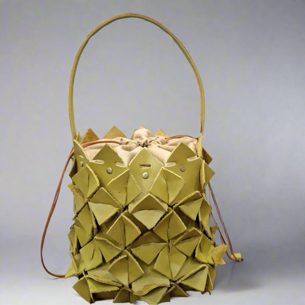 Bucket draw-string bag made from genuine leather scrap with nylon lining