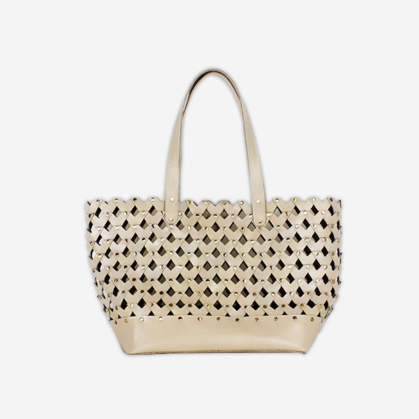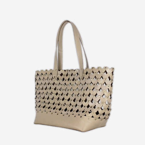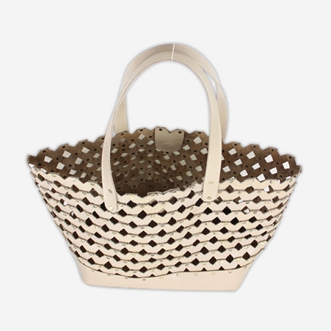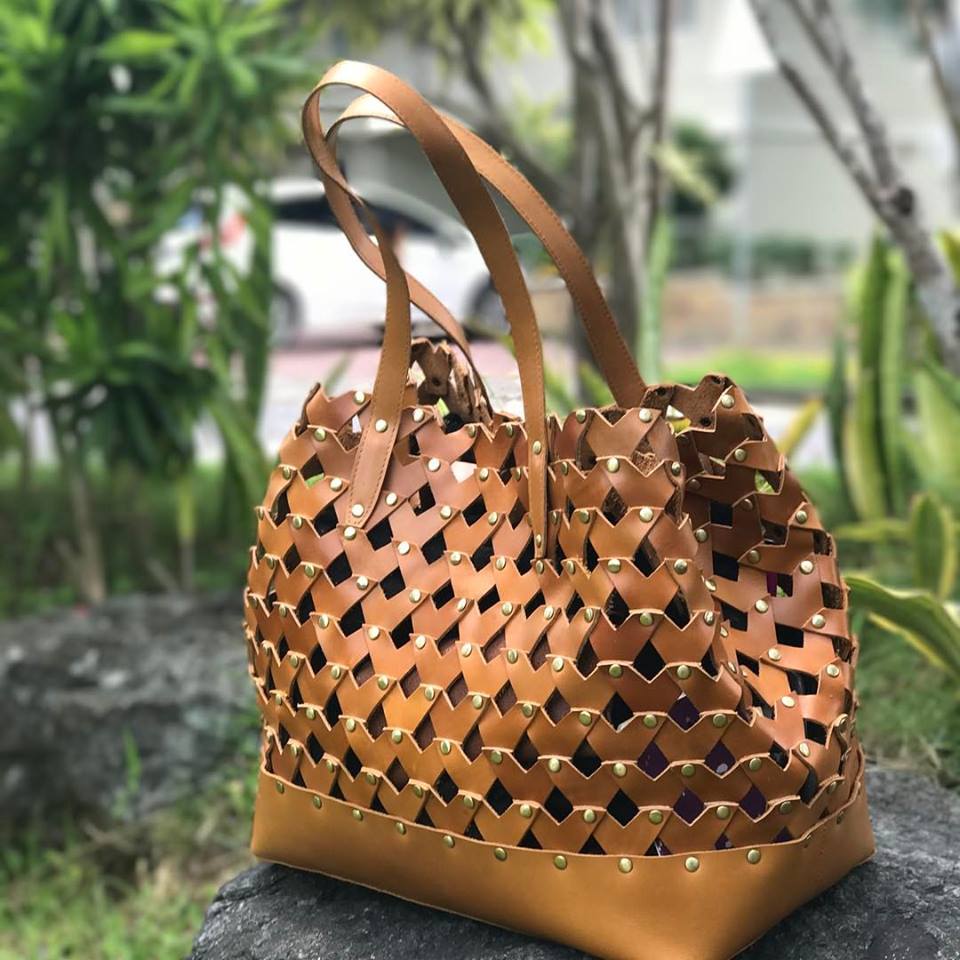 Tote made from genuine leather scrap with a solid leather accent at the bottom part of the bag